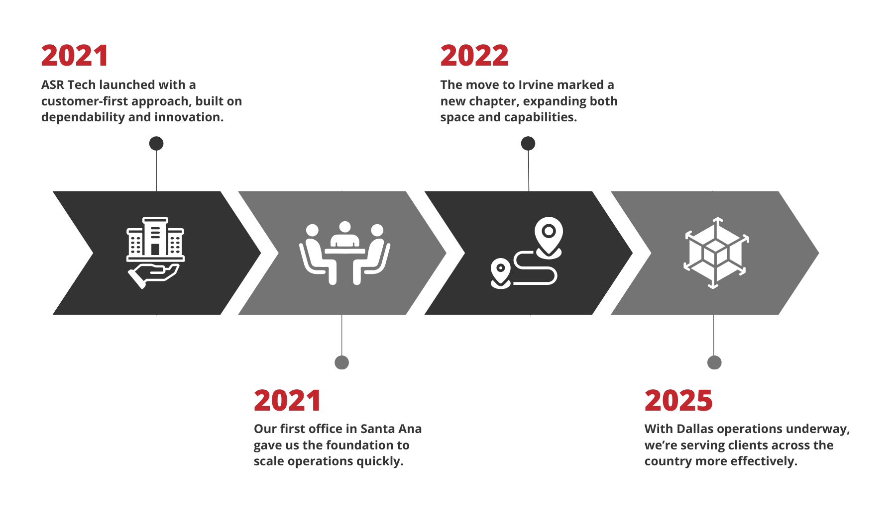 ASR Tech was founded in May of 2021 with a mission to deliver dependable, customer-focused IT solutions. That same year, the team established its first headquarters in Santa Ana, CA, laying the foundation for long-term growth. In 2022, the company relocated to its current office in Irvine, CA, expanding operational capabilities and strengthening its presence in Southern California. By 2025, we have grown beyond state lines, launching operations in Dallas, TX, to better serve national clients and support a rapidly expanding customer base.